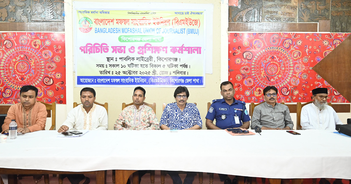 বাংলাদেশ মফস্বল সাংবাদিক ইউনিয়ন (বিএমইউজে) কিশোরগঞ্জ জেলা শাখা আয়োজিত পরিচিতি ও প্রশিক্ষণ কর্মশালা শনিবার (২৫ অক্টোবর) সকাল ১০ ঘটিকায় কিশোরগঞ্জ পাবলিক লাইব্রেরী হলে অনুষ্ঠিত হয়। অনুষ্ঠানের প্রশিক্ষণ কর্মশালায় ২৫ জন প্রশিক্ষণার্থী প্রশিক্ষণ গ্রহণ করেন, প্রথম অধিবেশনে সভাপতিত্ব করেন বিএমইউজে জেলা সভাপতি দৈনিক কালের সংবাদ সম্পাদক খায়রুল ইসলাম।