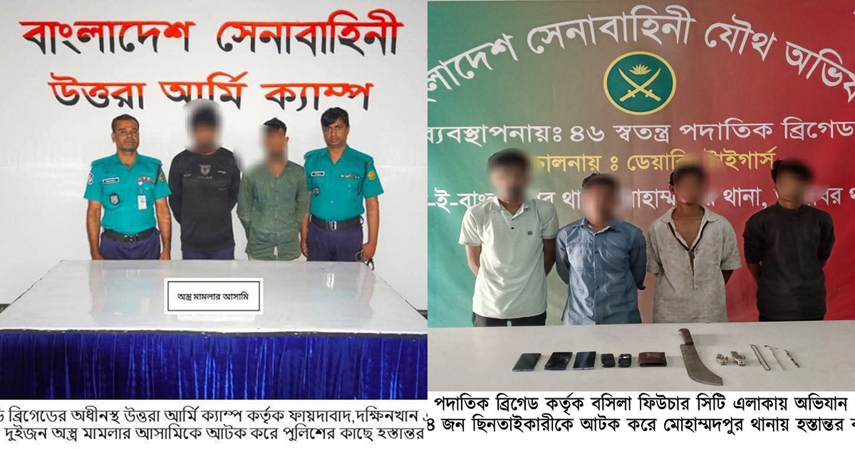 দেশের বর্তমান প্রেক্ষাপটে সামগ্রিক আইনশৃঙ্খলা পরিস্থিতি নিয়ন্ত্রণে রাখার উদ্দেশ্যে বাংলাদেশ সেনাবাহিনী সর্বোচ্চ পেশাদারিত্ব, শৃঙ্খলা ও নিষ্ঠার সাথে দায়িত্ব পালন করে যাচ্ছে। এরই ধারাবাহিকতায়, গত ০৬ নভেম্বর ২০২৫ থেকে ১৩ নভেম্বর ২০২৫ তারিখ পর্যন্ত বাংলাদেশ সেনাবাহিনীর বিভিন্ন পদাতিক ডিভিশন ও স্বতন্ত্র ব্রিগেডের অধীনস্থ ইউনিটসমূহ কর্তৃক অন্যান্য আইনশৃঙ্খলা রক্ষাকারী বাহিনীর সমন্বয়ে রাজধানীসহ দেশের বিভিন্ন এলাকায় বেশকিছু যৌথ অভিযান পরিচালনা করা হয়।