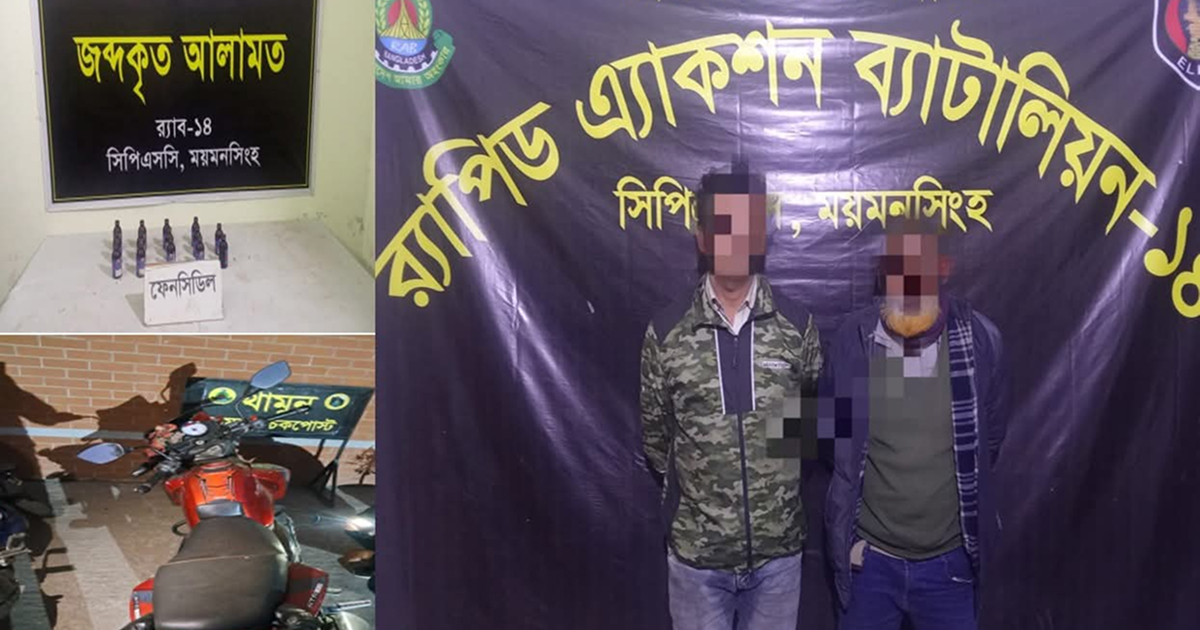 সিপিএসসি, র্যাব-১৪, ময়মনসিংহ এর আভিযানিক দল গোপন সংবাদের ভিত্তিতে ০৪ ফেব্রুয়ারী ২০২৬খ্রিঃ বিকাল অনুমান ১৬৪৫ ঘটিকায় ময়মনসিংহ জেলার মুক্তাগাছা থানাধীন ভাবকির মোড় সংলগ্ন মেসার্স জান্নাত ফার্নিচার এর সামনে ময়মনসিংহ-জামালপুর রোডে পাকা রাস্তার উপর চেকপোস্ট স্থাপন করে। উক্ত চেকপোস্টে একটি মোটরসাইকেল চেকপোস্ট অতিক্রম করাকালীন সিগন্যাল দিয়ে থামিয়ে মাদককারবারি ১। মোঃ ভুট্টো মিয়া (৫০), থানা-পলাশবাড়ী, ২। মোঃ আরিফুল আহাদ (৪২), থানা-গাইবান্ধা সদর, উভয় জেলা- গাইবান্ধাদের আটক করে। উপস্থিত সাক্ষীদের উপস্থিতিতে তাদের জিজ্ঞাসাবাদে অবৈধ মাদকদ্রব্য ফেন্সিডিল থাকার কথা স্বীকার করে। তাদের দেওয়া তথ্যে এবং দেখানো মতে মোটরসাইকেলে বক্সের ভিতর বিশেষ কায়দায় রক্ষিত অবৈধ মাদকদ্রব্য ১৪ (চৌদ্দ) বোতল ফেন্সিডিল উদ্ধার করতঃ ০৩ টি মোবাইল ফোন এবং মোটরসাইকেল জব্দ করতে সক্ষম হয়। উদ্ধারকৃত অবৈধ মাদক দ্রব্য ফেন্সিডিল এর আনুমানিক বাজার মূল্য ২৮,০০০/-(আটাশ হাজার) টাকা।