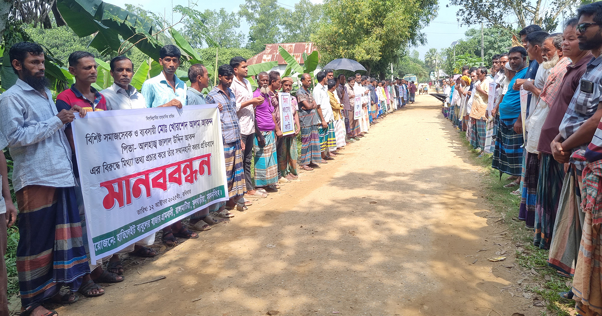 ফুলবাড়িয়া উপজেলার হাতিলেইট বাবুলের বাজারের ব্যবসায়ী খোরশেদ আলম আকন্দের সম্মানহানী ও তাঁর বিরুদ্ধে মিথ্যা মামলাসহ হুমকির প্রতিবাদে কয়েকশ গ্রামবাসী ঘন্টা ব্যাপী মানববন্ধন করেছে।