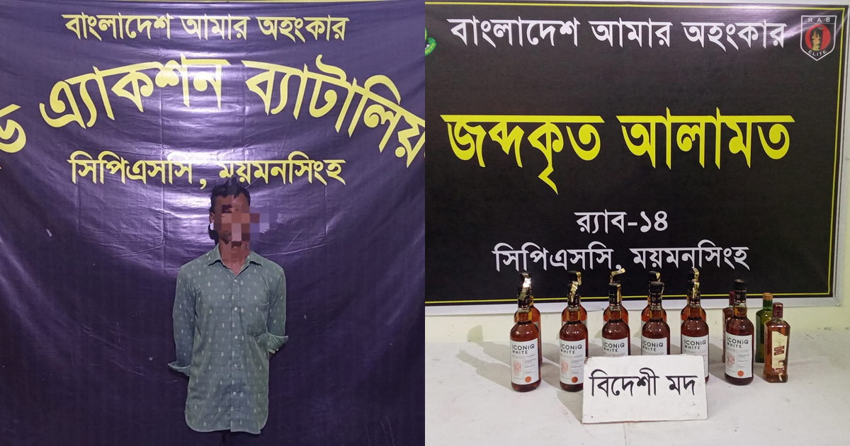 সিপিএসসি, র্যাব-১৪, ময়মনসিংহ এর একটি আভিযানিক দল গোপন সংবাদের ভিত্তিতে ১৯ অক্টোবর ২০২৫খ্রিঃ অনুমান ১৫:৩০ ঘটিকায় ময়মনসিংহ জেলার কোতোয়ালী থানার কেওয়াটখালী রেলক্রসিং এর পশ্চিমে ময়মনসিংহ হতে ঢাকাগামী প্রধান সড়কের পাকা রাস্তার উপর চেকপোস্ট স্থাপন করে। উক্ত চেকপোস্টে শেরপুর থেকে ছেড়ে আসা সোনার বাংলা পরিবহন বাসে যাত্রীদের ব্যাগ ও অন্যান্য মালামাল তল্লাশীকালে ধৃত মাদককারবারি এরশাদ আলম (২৮), জেলা-শেরপুর এর নিকট ব্যাগ দেখে সন্দেহ হয়। জিজ্ঞাসাবাদে তার দেওয়ার তথ্যের ভিত্তিতে ব্যাগের ভিতর হতে ১৪ (চৌদ্দ) বোতল বিদেশী মদ এবং ০১(এক) টি মোবাইল ফোন উদ্ধার করতে সক্ষম হয়। উদ্ধারকৃত অবৈধ বিদেশী মদের আনুমানিক অবৈধ বাজার মূল্যে ১,২৫,০০০/- (এক লক্ষ পঁচিশ হাজার) টাকা।