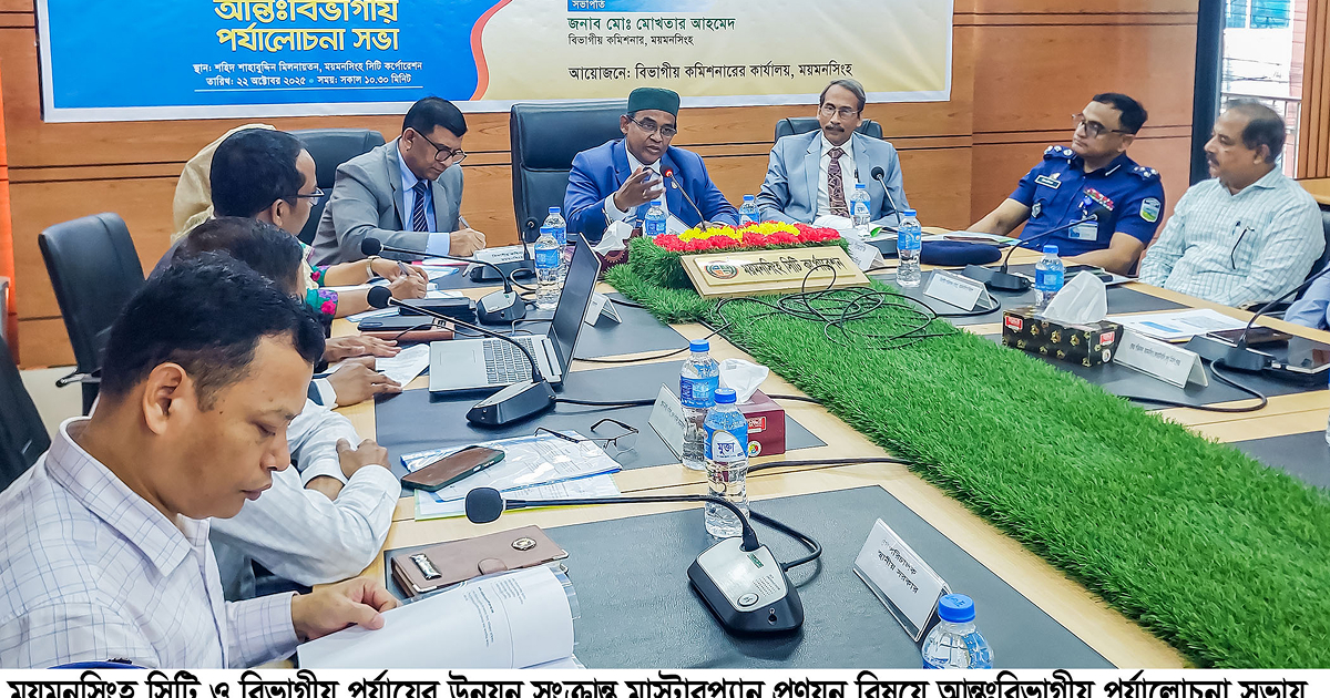 ময়মনসিংহ সিটি ও বিভাগ পর্যায়ের উন্নয়ন সংক্রান্ত মাস্টার প্ল্যান প্রণয়ন বিষয়ে আন্তঃবিভাগীয় পর্যালোচনা সভা অনুষ্ঠিত হয়েছে। বুধবার (২২ অক্টোবর) সকালে ময়মনসিংহ বিভাগীয় কমিশনার কার্যালয়ের আয়োজনে সিটি কর্পোরেশনের শহীদ শাহাবুদ্দিন মিলনায়তনে এ সভা অনুষ্ঠিত হয়। ময়মনসিংহ বিভাগীয় কমিশনার মোঃ মোখতার আহমেদের সভাপতিত্বে অনুষ্ঠানে প্রধান অতিথি হিসেবে উপস্থিত ছিলেন ভৌত অবকাঠামো বিভাগ, বাংলাদেশ পরিকল্পনা কমিশনের সদস্য (সিনিয়র সচিব) এম এ আকমল হোসেন আজাদ।